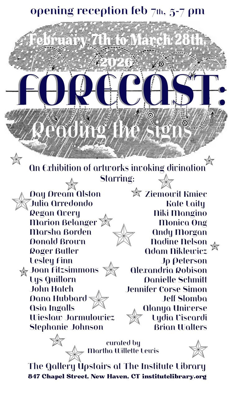 - Next month I’ll be showing work at The Institute Library in New Haven as part of Forecast: Reading the Signs, an exhibition of artworks exploring divination and prediction curated by Martha Willette Lewis. I predict the group show magic will be strong with this one and am looking forward to it.