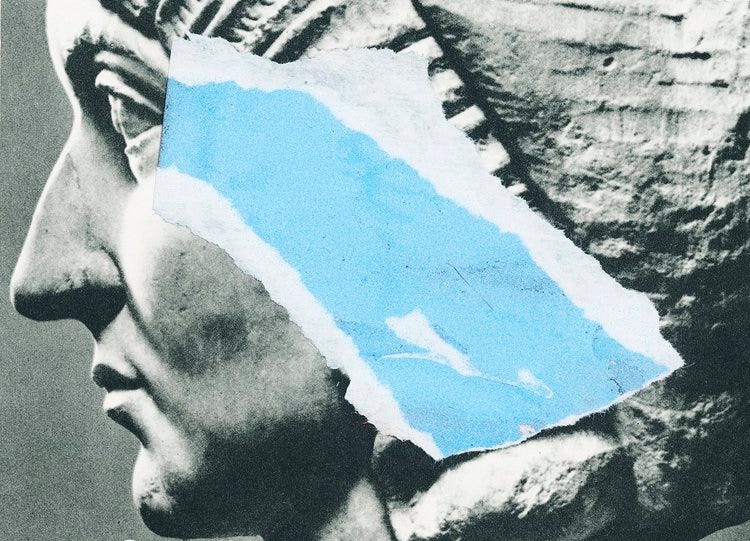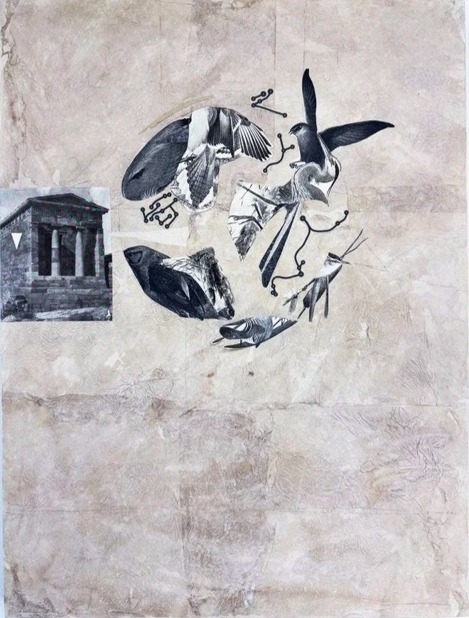 This woman, a fragment of a massive painting, reminds me why dealing in fragments is so important. By focusing on them and scrutinizing their context, then giving them a new one, we bring stories and lives and materials marginalized in the archives and history books to the center. We shatter the patriarchal lens and see the material anew. Collage, with its material deconstruction, can help us see the invisible structures that protect and perpetuate limiting ideology. And collage, through material reimagination, can illuminate a path forward—even if sometimes it’s only to spotlight the path that should not be walked again.