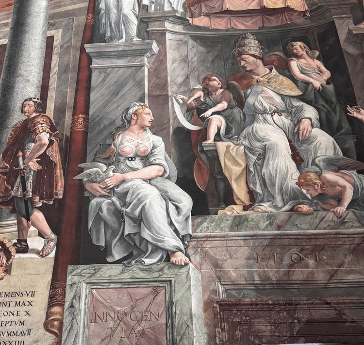 The most compelling art we saw was in the Hall of Constantine, an ornate room with walls and ceilings painted with the church’s greatest hits— suppressing paganism through terror and violence, etc. The hall was completed in the 1500s. Of the dozens of figures and scenes painted on the walls, my focus was fixed a single woman, perched above the doorway to the next room.